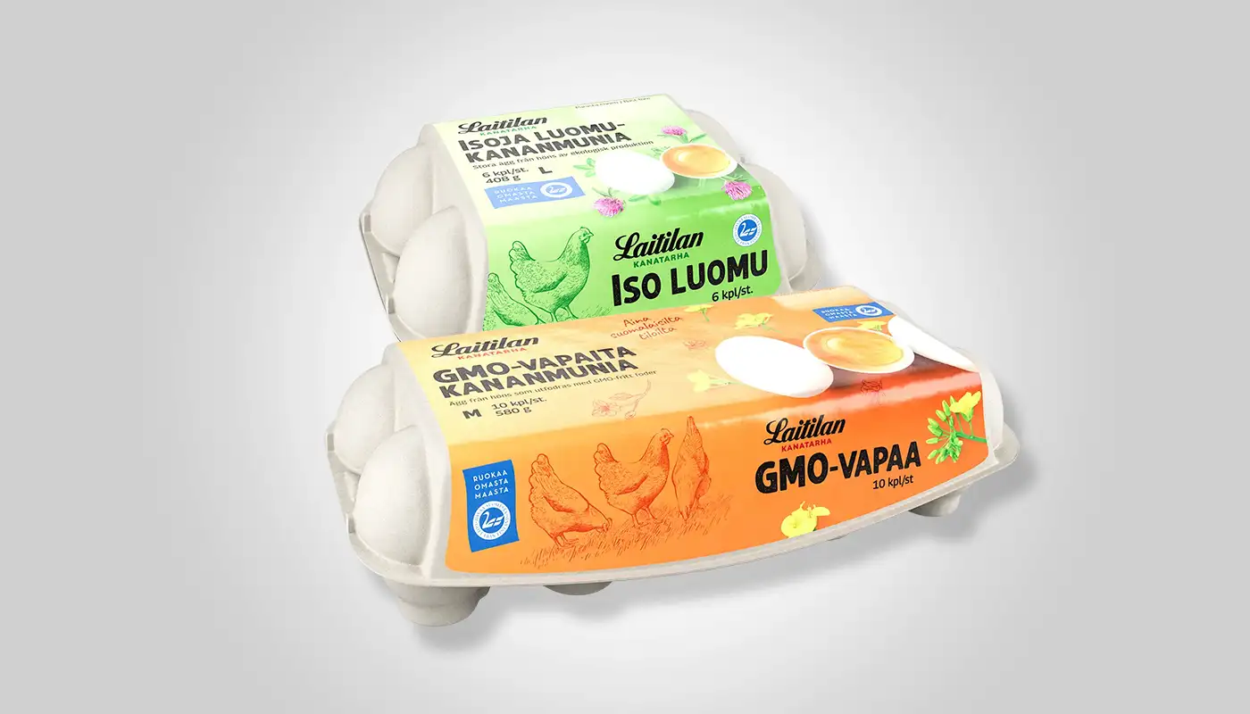 3D modeling and product images for egg cartons for Laitilan Kanatarha. The client wanted to try 3D modeling for their products due to recurring label updates, with the goal of speeding up the creation of product images after each update. The product line included several items in different sizes. All products were produced by modeling only three different packages. The client supplied packaging samples and label files.