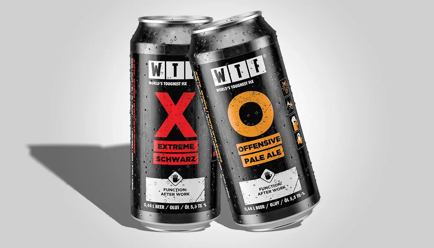 3D modeling and visualization for WTF beers sold as merchandise. In addition to five different 3D product images of the beers, the client wanted images of the products arranged in point-of-sale displays—specifically, in refrigerated display cases. This ensures a consistent visual style for marketing materials featuring the displays as well. The client supplied untextured 3D models of the displays from the manufacturer, along with the product label files. The can was modeled after a standard 0.5 L store-bought can.