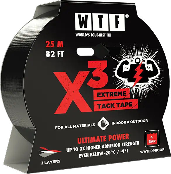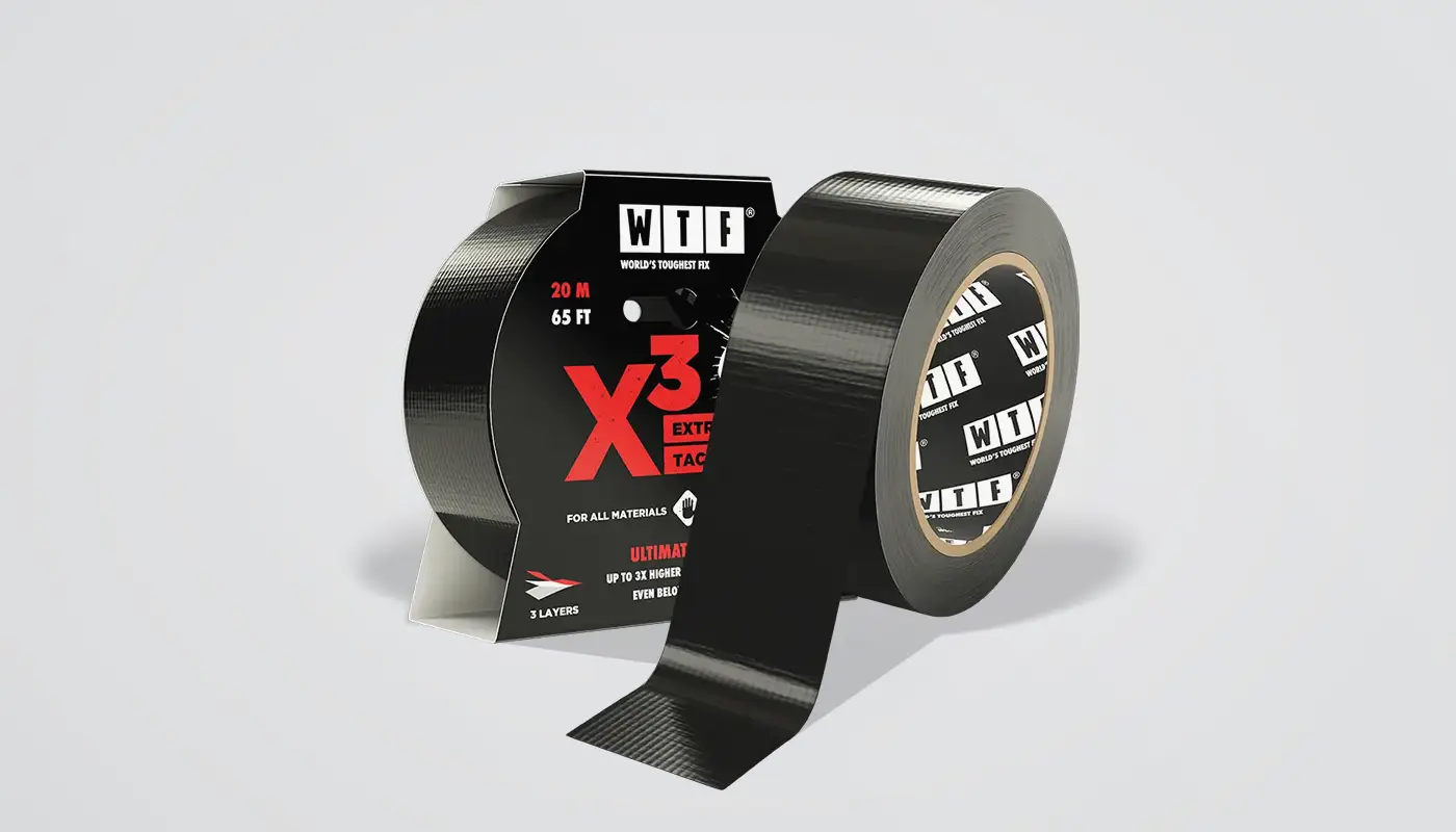 3D modeling and product images for WTF — Extreme Tack X3 duct tape. The project included two product images for two product sizes, both with packaging and without. These products were also intended for pre-sales. The product itself was modeled from a real sample, and the packaging was modeled using the die-cut lines from the label file. A frequent challenge with this approach is folding the packaging die lines without a reference image.